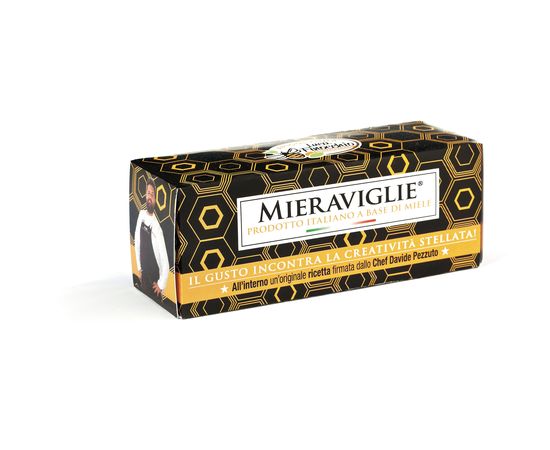 Il miele stellato incontra lo chef stellato. Le nuove confezioni regalo nascono dal binomio vincente con lo Chef Davide Pezzuto, che ha ideato e firmato le ricette originali presenti all'interno delle confezioni. Composizione gourmet di tre barattolini mignon di Mieraviglie da g 40, nei gusti assortiti tra: